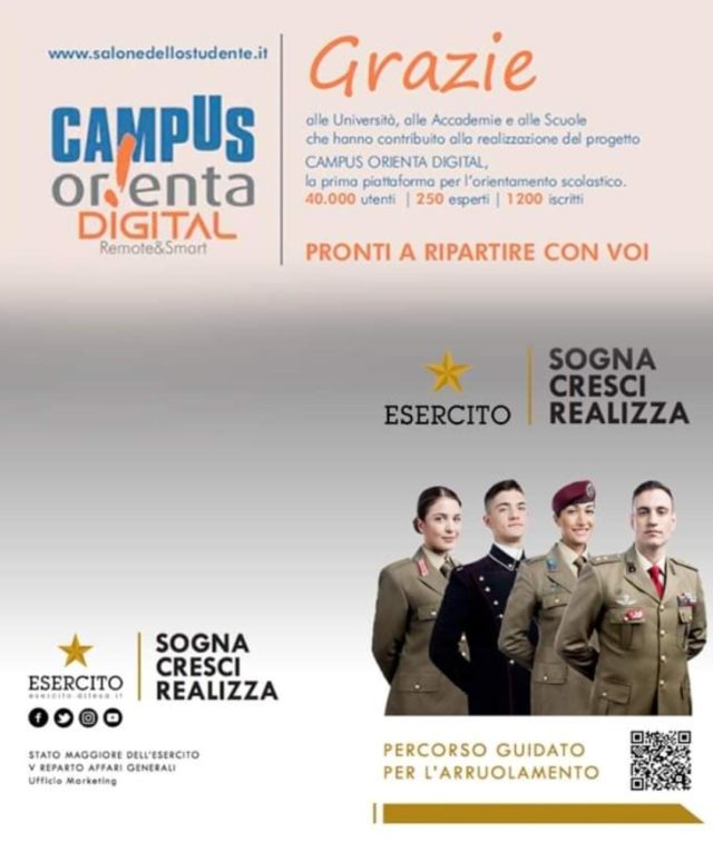 L’Esercito italiano quest’anno ha deciso di partecipare al Campus Orienta Digital, il tour digitale del Salone dello Studente, per sostenere gli studenti in questa scelta e informare sulle occasioni che offre il mondo della Difesa e sulle opportunità di arruolamento.
