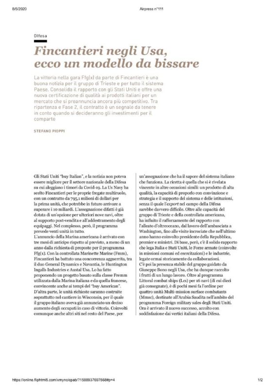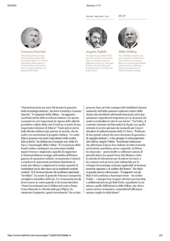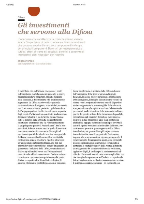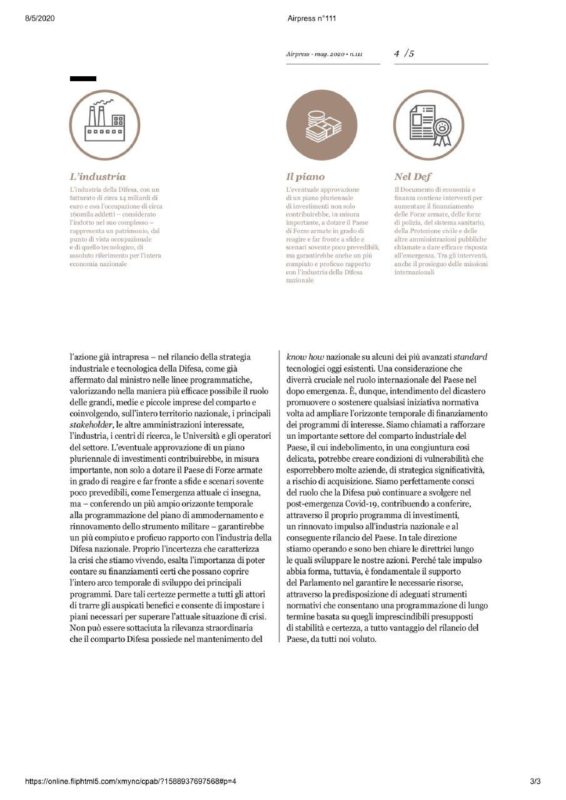L’eventuale approvazione di un piano pluriennale di investimenti contribuirebbe, in misura importante, non solo a dotare il Paese di Forze armate in grado di reagire e far fronte a sfide e scenari sovente poco prevedibili, come l’emergenza attuale ci insegna, ma – conferendo un più ampio orizzonte temporale alla programmazione del piano di ammodernamento e rinnovamento dello strumento militare – garantirebbe un più compiuto e proficuo rapporto con l’industria della Difesa nazionale.
