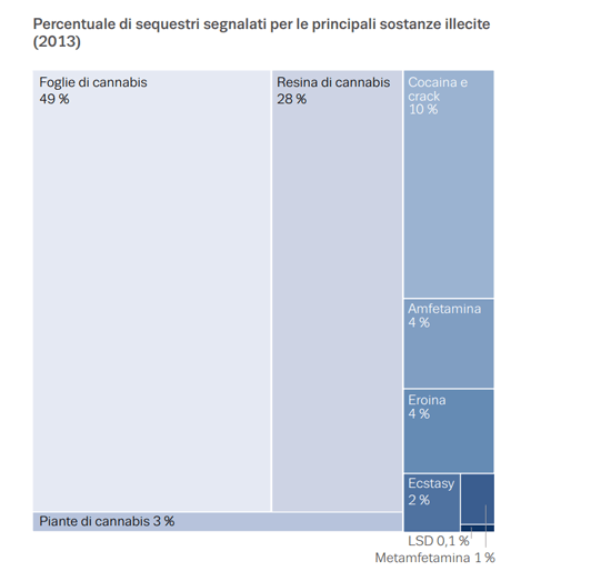Nondimeno, la quantità di resina di cannabis sequestrata nell’Unione europea è assai più alta della quantità di foglie di cannabis (460 tonnellate contro 130 tonnellate).