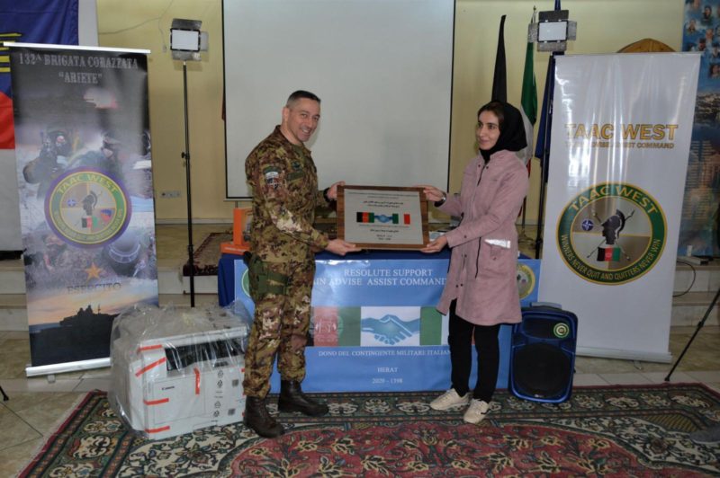 Il contingente italiano di “Resolute Support“, attualmente a guida 132ª Brigata Corazzata “Ariete”, ha donato all’Associazione femminile giornaliste di Herat materiale informatico, tecnico e fotografico per facilitare lo svolgimento della loro professione lavorativa.
