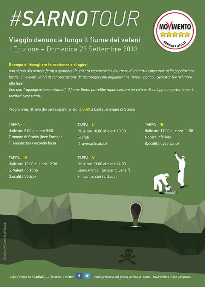 Il “Tavolo Tecnico per il Disinquinamento e la Riqualificazione del Bacino del Sarno” del Movimento 5 Stelle Campania promuove l’evento “S arno Tour” al fine di accendere i riflettori sul disastro ambientale che riguarda il bacino idrografico del Sarno, nuovamente minacciato in questo periodo da un progetto suicida quale il “Grande Progetto Sarno”.